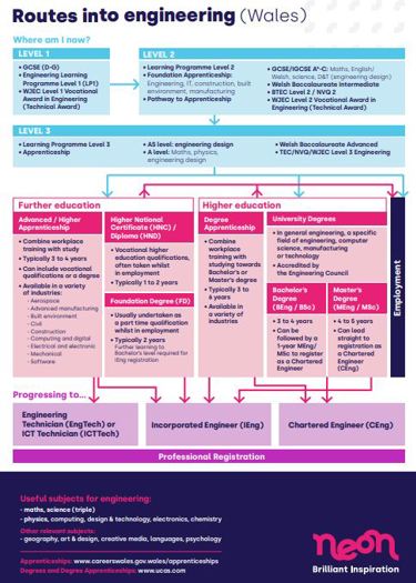 Discover the skills and careers pathways available to students in Wales. For students working at Level 1, Level 2 or Level 3, in-school qualifications such as GCSEs, Engineering Learning Programme or WJEC Level 1 or 2 Vocational Award in engineering are a fantastic route into a future engineering or tech career.