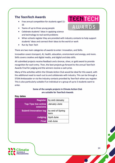 A climate action club is an extra-curricular club for students aged 11 to 14 to work on engineering or technology-based projects taking action to reduce a school’s and/or a community’s contribution to climate change. We recommend it take place once a week either after school or during lunch, and we provide resources for students to undertake their own projects on a range of themes.