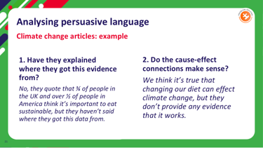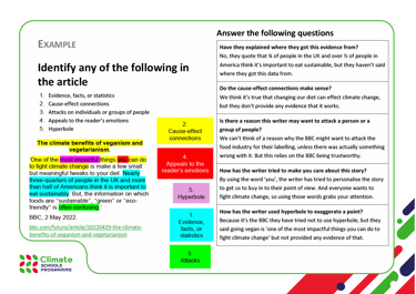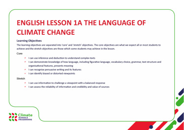 This is English lesson 1A of the Climate Schools Programme. In these lessons the subject of climate change is a lens to explore communication, persuasive language and debate. Young people will engage with a lot of information on climate change. This lesson supports you to help them to understand the topic, analyse it and reach conclusions. These lessons do not require a scientific understanding of climate change and focus on English language techniques.