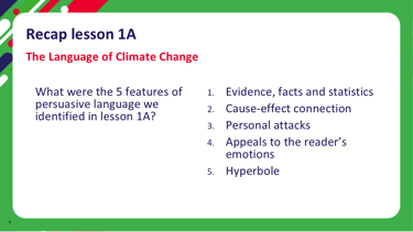 This is English lesson 1B of the Climate Schools Programme. In these lessons the subject of climate change is a lens to explore communication, persuasive language and debate. Young people will engage with a lot of information on climate change. This lesson supports you to help them to understand the topic, analyse it and reach conclusions. These lessons do not require a scientific understanding of climate change and focus on English language techniques.
