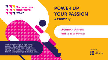 Tomorrow’s Engineers Week 2024, from EngineeringUK, is a yearly series of events and activities for schools across the UK. This Power up your passion assembly is designed to inspire students with ideas for how to discover their passion – the sweet spot where their interests and talents meet – and how to identify what activities and qualification routes can turn this into an engineering or technology career. A follow-on lesson helps students to plan how they can apply curiosity, creativity and persistence to move forward in their learning and get ready for their career.