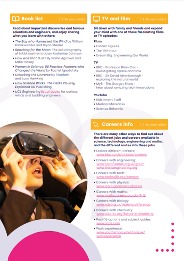 Discover suggested STEM inspiration and career resources to explore at home, including podcasts, competitions and days out. This resource is also great to share with parents to support them at home.